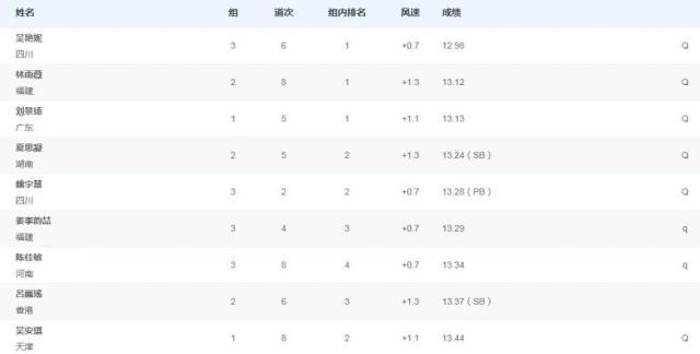 根据晋级规则,三个小组每组前两名以及剩余选手中预赛总成绩最好的两名选手,共计8名选手晋级今晚的决赛。四川选手吴艳妮在预赛第三组第六道登场,她发挥稳定跑出12秒98位列小组第一,顺利晋级决赛,她的四川队队友魏宇慧跑出个人最好成绩13秒28获得这一小组的第二名,同样晋级决赛。