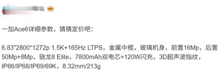 博主 @数码闲聊站 曝光一加 Ace6 手机详细参数,这款新机将于 10 月 27 日与一加 15 手机一同发布。(来源:IT之家)