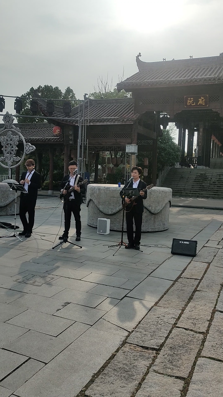 董亦含、林晓明、杜烁辰(从左至右)在鸠兹小镇上演唱
