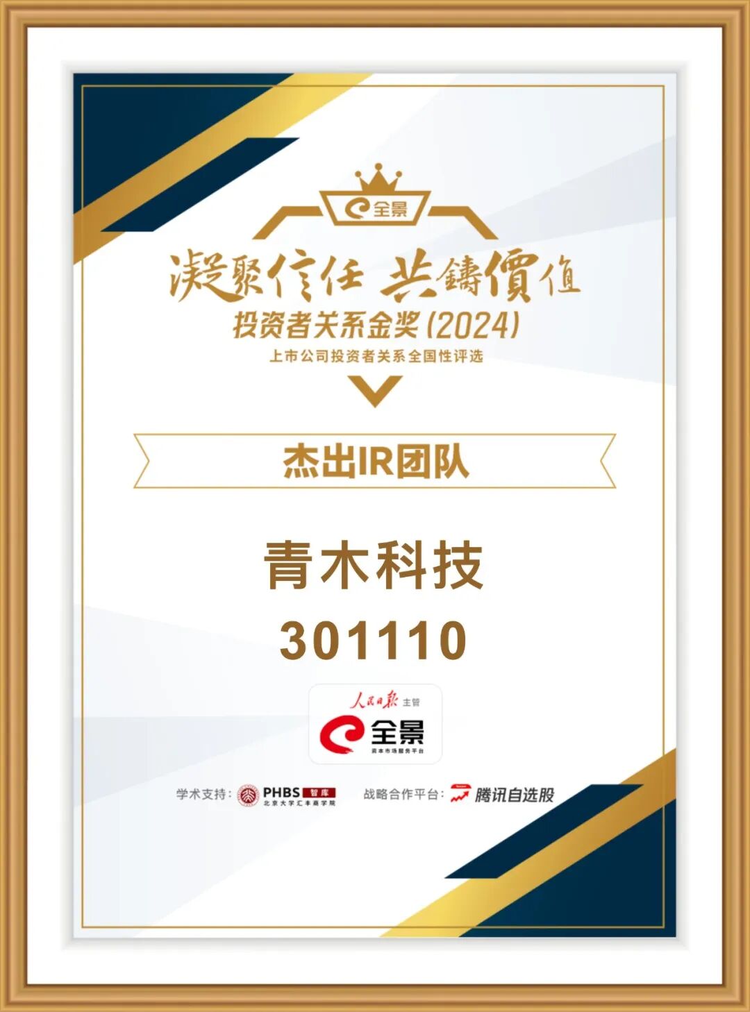青木科技在上市后第三年的信息披露考核中荣获A级评价,这充分体现了监管部门对公司在规范运作、高质量信息披露以及投资者关系管理工作方面的认可。自上市以来,青木科技始终坚持以规范运作为基石,认真履行上市公司的信息披露义务,打造透明规范的信息披露体系和多元化的投资者沟通机制。近两年来,公司及证券部团队先后获得了中国上市公司协会评选的“业绩说明会最佳实践案例”、全景网评选的“杰出机构关注奖”以及“杰出投关团队”等一系列奖项及荣誉称号。