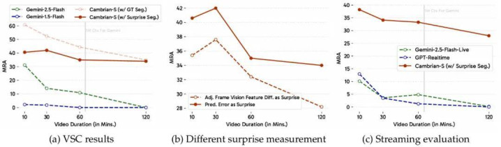 结果。Gemini-1.5-Flash 在 VSC 上的表现接近零(图 13a),显示了该任务的难度。尽管 Gemini-2.5-Flash 在 10 分钟视频上取得了更好的结果,但其性能在更长的视频上迅速下降。相比之下,Cambrian-S (带惊讶度分割) 使用的惊讶度驱动的事件分割方法在所有视频长度上都取得了更高、更稳定的性能。当使用真实的场景切换来分割视频时(即 Cambrian-S 带 GT 分割),性能进一步提高,这代表了一个近似的上界。