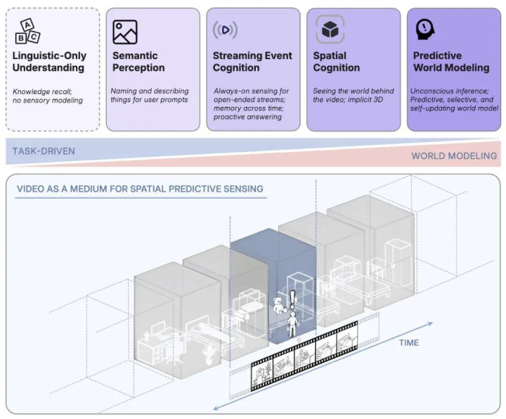 参照图 1,空间超感知要求 MLLM 具备四种关键能力:语义感知、流式事件认知、隐式 3D 空间认知和预测性世界建模。