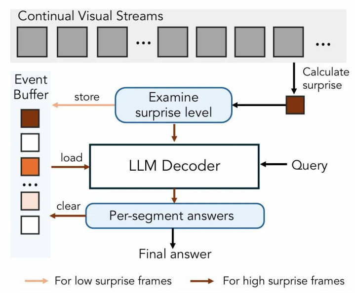 研究者提出将预测性感知作为一种前进的路径,即模型学习预测其感知输入,并构建内部世界模型来处理无界的视觉流。这一设计受到了人类认知理论的启发。与当前标记化并处理整个数据流的视频多模态模型不同,人类的感知(和记忆)具有高度选择性,只保留一小部分感知输入。大脑不断更新内部模型以预测传入的刺激,压缩或丢弃那些不贡献新信息的、可预测的输入。相反,违背预测的意外感知信息会产生「惊讶度」,并驱动注意力和记忆编码的增强。