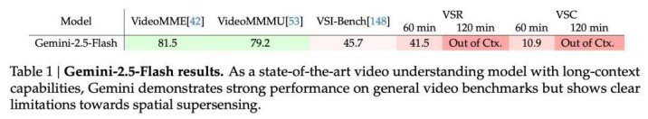 尽管研究者的基准是合成的,但它反映了空间超感知中的一个真正挑战:人类能毫不费力地整合和保留来自持续数小时或数年的感官体验中的信息,但当前模型缺乏用于持续感知和记忆的相应机制。Gemini-2.5-Flash 在以语义感知和语言理解为重点的视频基准(如 VideoMME 和 VideoMMMU)上表现出强劲性能,实现了约 80% 的准确率。