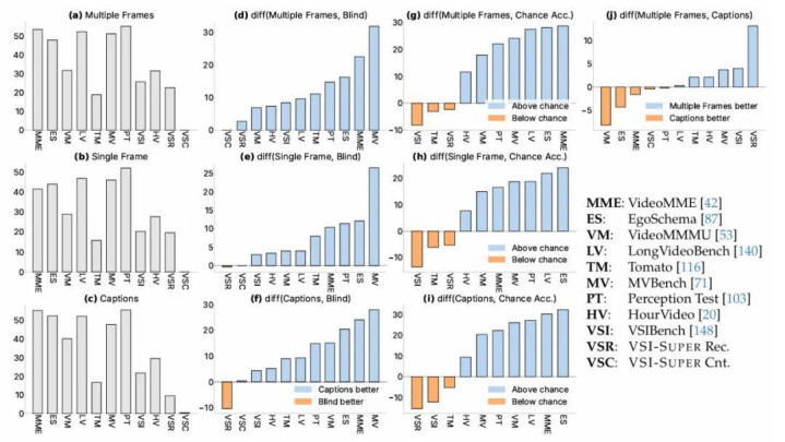 解读使用「多帧」和「帧字幕」之间的性能差异(图 2 j),一个显著的正差值(偏向于多帧输入)标志着该基准对精细视觉感知的需求。相反,一个很小或负的差值(更偏向于「帧字幕」)则表明其具有更强的以语言为中心的性质。研究者的分析将 VideoMMMU、EgoSchema、VideoMME、Perception Test 和 LongVideoBench 归于后一类,表明它们可能更依赖于语言理解而非视觉提示。一个显著的例外是 VSC,它对当前的 MLLM 来说是如此具有挑战性,以至于所有三种输入条件都产生接近于零的性能,从而排除了它们之间任何有意义的比较。