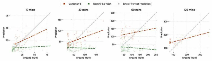图 14 的更深入分析显示,Gemini-2.5-Flash 的预测被限制在一个有限的范围内,并且不会随着视频中出现更多物体而扩展。相比之下,Cambrian-S (带惊讶度分割) 产生的计数虽然尚未完全准确,但与真实物体数量表现出更强的相关性,表明其具有更好的泛化能力。