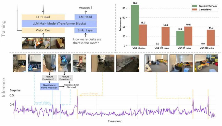研究者通过一种自监督的下一潜在帧预测方法来构建这一概念的原型。由此产生的预测误差可作为两个关键能力的控制信号:用于选择性保留重要信息的内存管理,以及用于将无界流分割成有意义的块的事件分割。研究者通过在 VSI-SUPER 上的两个案例研究证明,该方法显著优于强大的长上下文和流式视频模型基线。